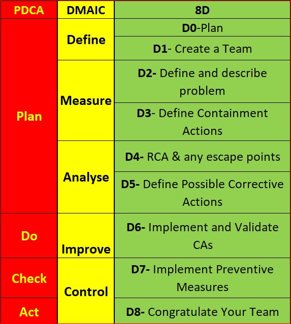 Most consider DMAIC the same as PDCA, just more focused on clarifying the PDCA cycle in order to reduce iterations by shifting the focus away from potential multiple cycles to achieving the most effective improvement the first time (though failure is still built into the process). The 8D method is once again pretty much the same process, as you can see.