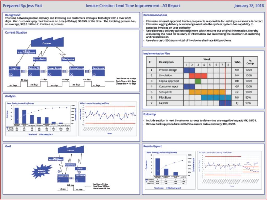 The A3 Report is a model developed and used by Toyota and currently used by many businesses around the world. The A3 Report is named for a paper size-A3 (29.7 x 42.0cm, 11.69 x 16.53 inches). The entire current state and PDCA aspects of the project are captured visually for easy communication and reference. When CIP projects use an A3 methodology to track projects, it has been demonstrated that clear visual communication helps the team members and the overall organization be more aware of the team’s progress.
